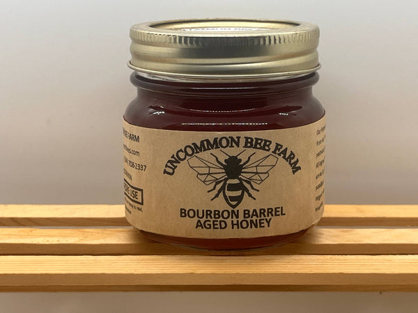 Experience the rich, complex flavors of Uncommon Bee's Bourbon Barrel Aged Honey. This unique honey is crafted by aging their pure, raw honey in reclaimed bourbon barrels, allowing it to absorb the deep, smoky notes and subtle hints of vanilla and oak from the bourbon.