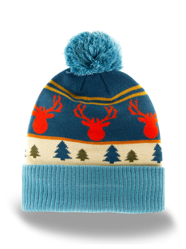 Reindeer Knit Beanie Winter Hat with Pom Pom Forest Tree Pattern Outdoor Style